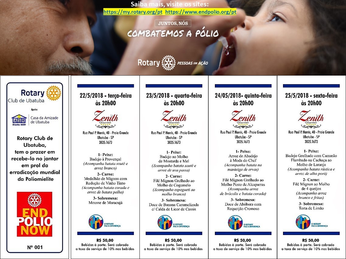 Evento realizado pelo Rotary Club de Ubatuba, com o apoio da Casa da Amizade de Ubatuba, para arrecadar fundos para a Campanha de Erradicação Mundial da Poliomielite, Paralisia Infantil.
