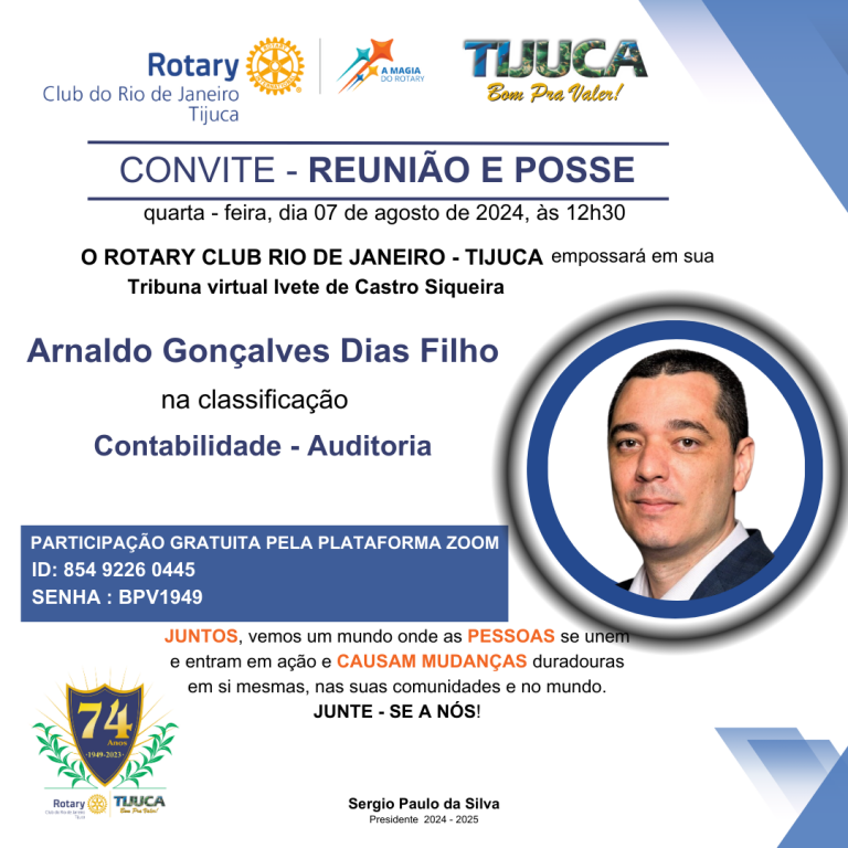 Visita Oficial da Governadora Alcione Viana ao Rotary da Tijuca, nesta quarta-feira, 7 de agosto, às 12:30hs, e a admissão do empresário contábil Arnaldo Gonçalves Dias Filho formam a agenda desta memorável reunião. Acesso gratuito pelo link https://us02web.zoom.us/j/85492260445?pwd=UvqYbZkp8OharpZclbkiCcbymo6pBP.1 senha BPV1949. Participe. Junte-se a nós para fazermos acontecer a Magia de Rotary!