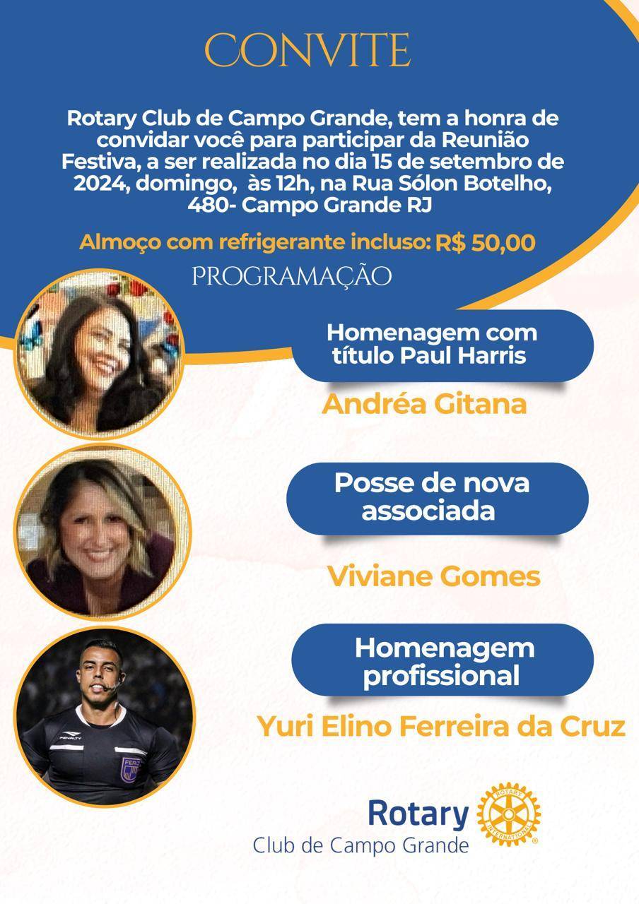 O Rotary Club de Campo Grande tem o prazer de convidar para nossa Festiva de posse, de uma nova associada representativa.