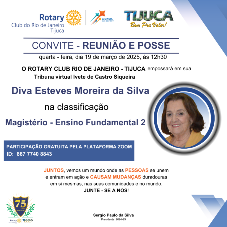 Água é Vida é o tema da reunião conjunta dos Rotary Clubs do Rio de Janeiro - Tijuca e de São José dos Campos - Satélite nesta próxima quarta-feira, 19 de março, às 12:30hs, apresentado pelo Diretor da CEDAE Daniel Okumura, e a posse da associada Diva Estaves ao Rotary da Tijuca, na classificação Magistério - Ensino Fundamental 2. Acesso gratuito pelo link https://us02web.zoom.us/j/86777408843