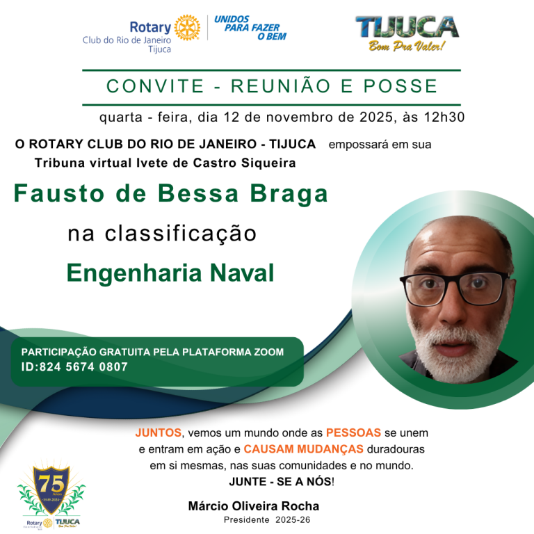 “O Rotary e a ONU” é o tema da reunião do Rotary da Tijuca na quarta feira, 12 de novembro, às 12:30hs, apresentado pelo jornalista e economista Fernando Antônio Quintella Ribeiro, e admissão do companheiro Fausto de Bessa Braga, ocupante da classificação Engenharia Naval. Acesso gratuito pelo link