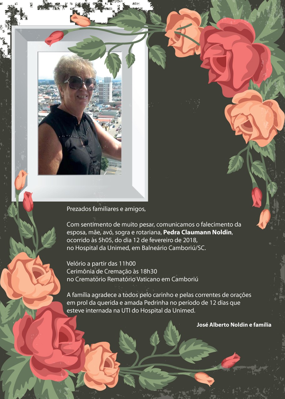 Retransmito acima o comunicado do Governador José Alberto Noldin do Distrito 4651 sobre o falecimento de sua esposa Pedra Claumann Noldin, ocorrido essa manhã.