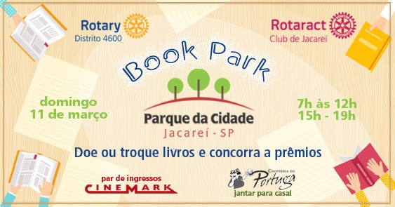 No Book Park que acontece domingo dia 11 de março de 2018, você doa ou troca livros em boas condições (qualquer gênero e idade, exceto didáticos) no Parque da Cidade de Jacareí-SP das 7h às 12h e das 15h às 19h e concorre a prêmios: um par de ingressos para o Cinemark ou um jantar para casal no Portuga. Os livros serão destinados para Bibliotecas Populares organizadas pelo Rotary D.4600 e pelo Rotaract de Jacareí. Venha, participe!