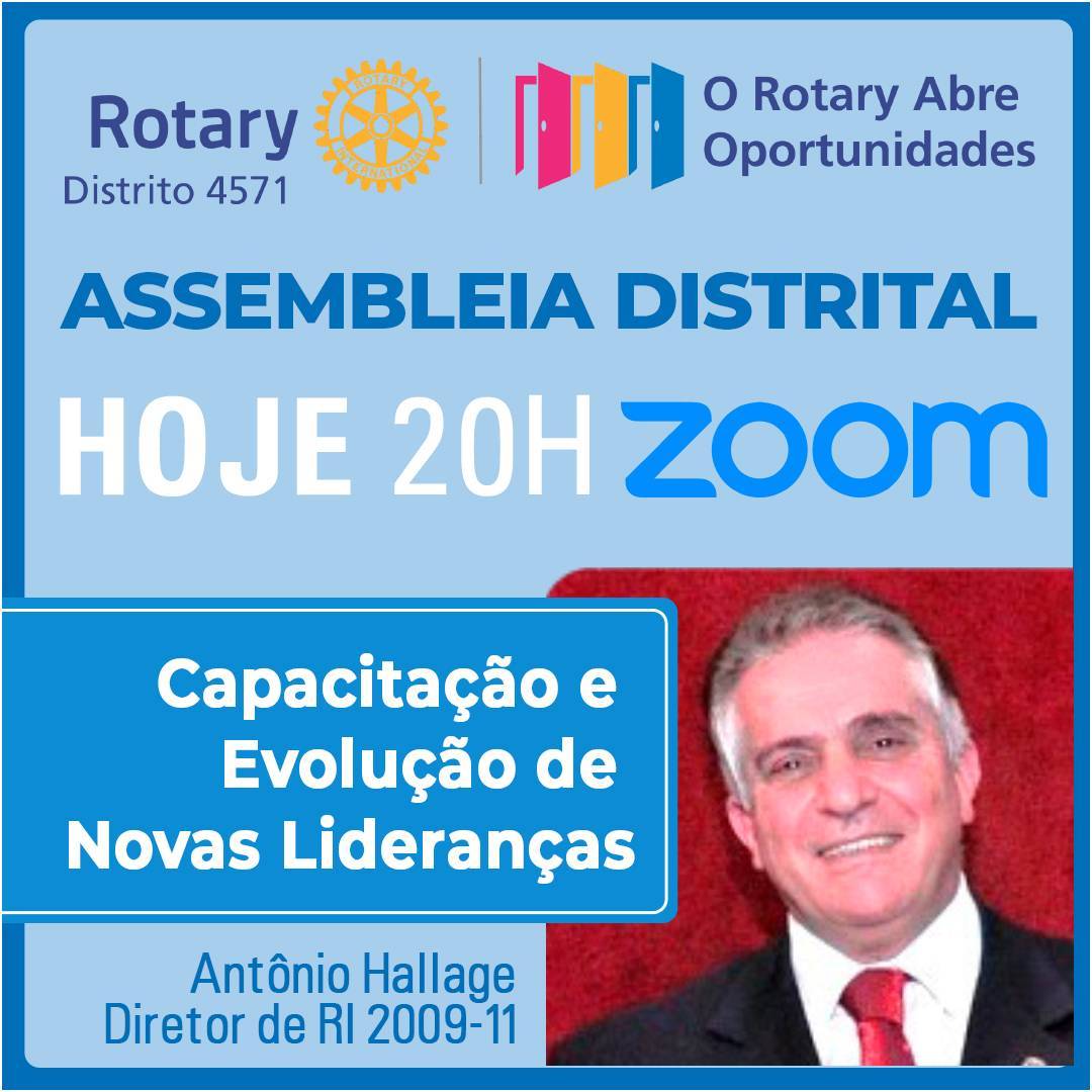 NOVIDADE | Abertura da Assembleia Distrital na sexta-feira, dia 22 de maio às 20h com presença do GD 1995-96 Antônio Hallage (D.4730), Diretor de Rotary International 2009-11 e Curador da Fundação Rotária 2011-15.
